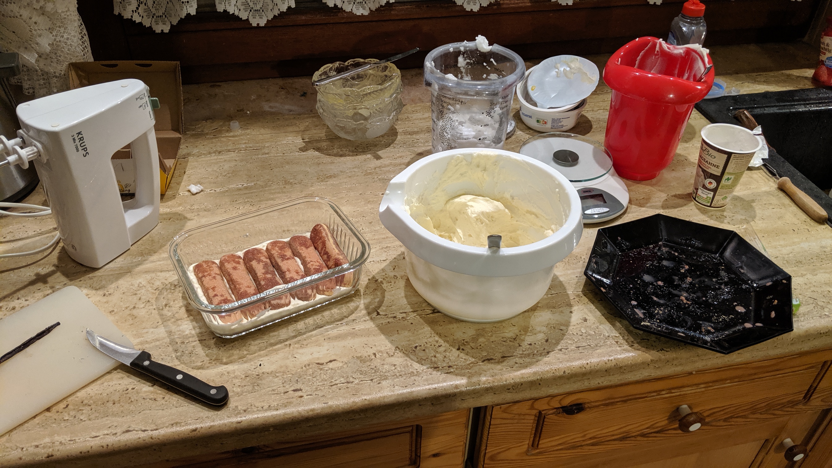 In einer Form abwechselnd Creme und Löffelbiskuit schichten. Dabei mit Creme beginnen und abschließen.
